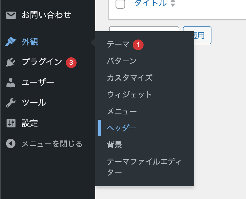 WordPress編集画面>外観>ヘッダー をクリック